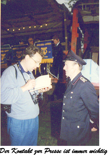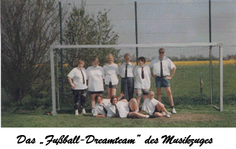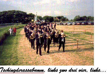 Und bereits nach 5 Monaten der erste Auftritt beim Zeltfest in Emmelsbüll. DasRepertoire besteht zwar nur aus 2 Stücken (Marsch König Friedrich der Große und Muss Idenn), aber das zahlreiche Publikum ist begeistert. Wahrscheinlich mehr vom Mut derAktiven als von der musikalischen Leistung. Inzwischen hat der Musikzug durch Klaus-Uwe Knackfuß (Klarinette) Verstärkung bekommen. Bis zu seinem frühen Tod ist er einerder engagiertesten Mitglieder.