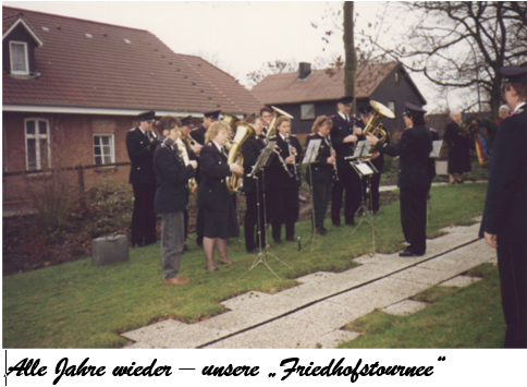 Zum Volkstrauertag wird mit der bis heute andauernden Traditionbegonnen, an den Ehrenmälern in Emmelsbüll, Horsbüll und Neugalmsbüllzu spielen. In späteren Jahren kommen noch Neukirchen und Deezbüllhinzu. Diese Einsätze führen oftmals zu organisatorischen Problemen, daes nicht leicht ist, 5 Einsätze teilweise zur gleichen Zeit und oftmals ineisiger Kälte oder Nässe an einem Vormittag zu absolvieren. Aber für denMusikzug ist dies natürlich kein Problem.